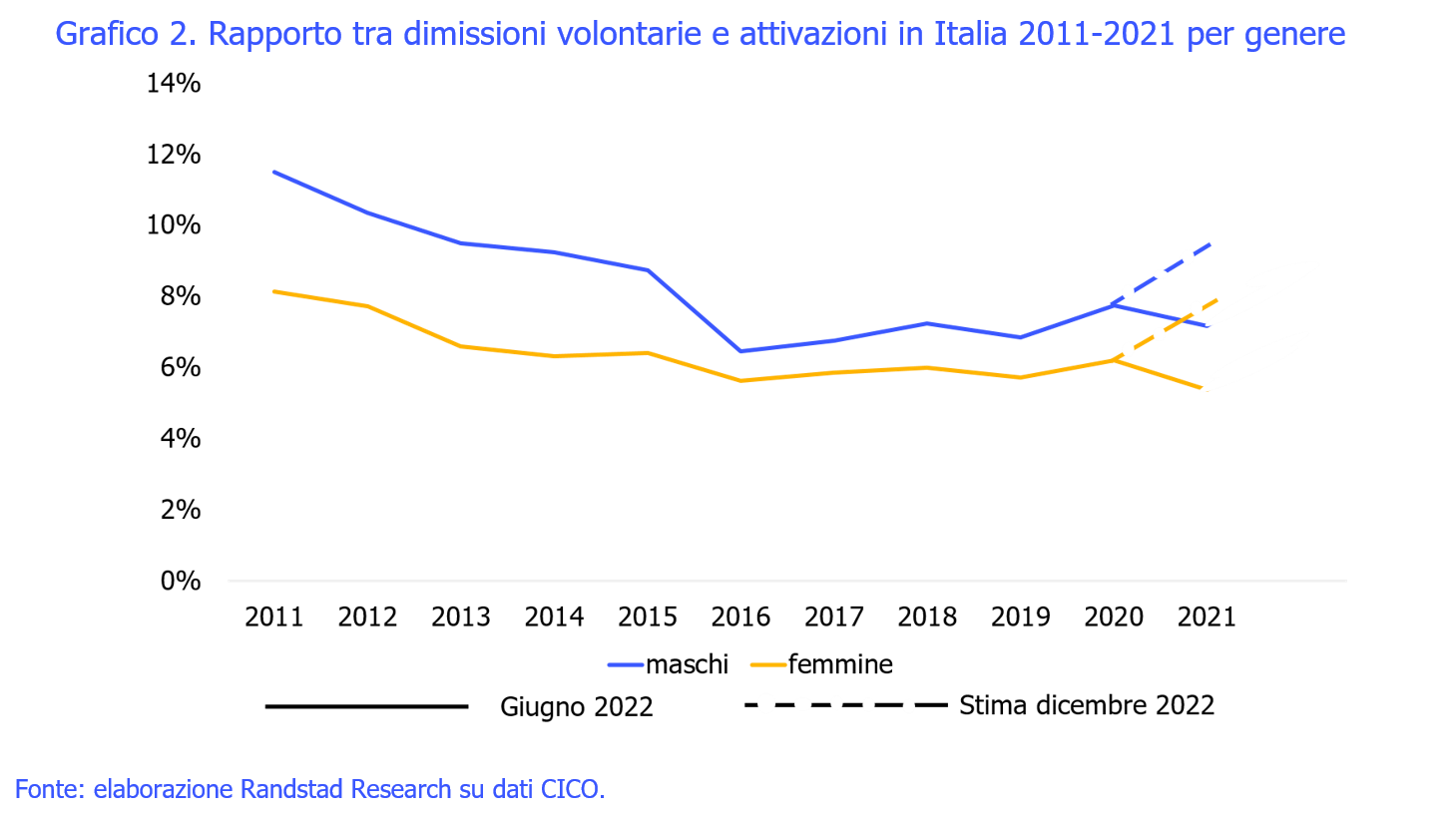 Le donne tendono a rimanere nello stesso settore leggermente più degli uomini: nel 2021, su 10 dieci donne che hanno cambiato lavoro, circa 5,8 sono rimaste nello stesso settore. Sempre nel 2021, su 10 uomini che hanno cambiato lavoro sono invece circa 4,8 quelli che sono rimasti nello stesso settore.