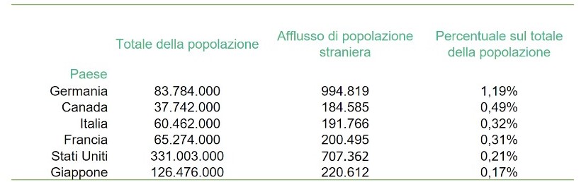 La tabella relativa ai flussi rappresenta invece il numero complessivo di persone nate all'estero e arrivate in uno dei sette Paesi selezionati nel corso dell’anno 2020.