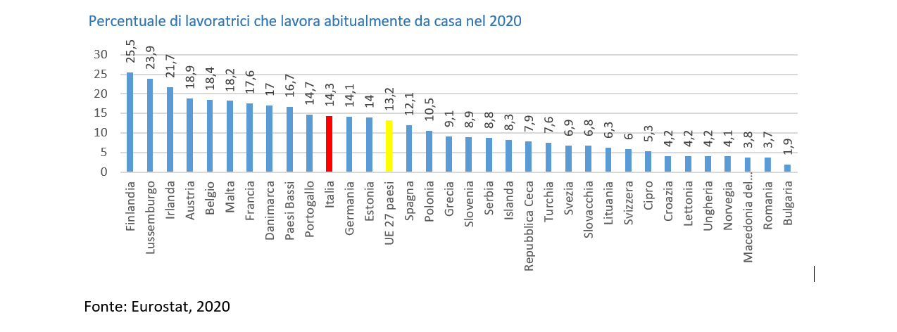Se nel 2019 solo il 3,3% delle donne lavoratrici dichiarava di lavorare “abitualmente” da casa, nel 2020 la percentuale sale al 14,3%. Sopra alla media UE (13,2%). Quanto ha influito la chiusura delle scuole insieme ad altri fattori connessi al lockdown? È lecito pensare che il lavoro a distanza, facilitato dalla normativa, sia stato per molte donne una scelta virtualmente obbligata.
