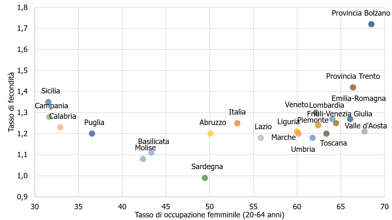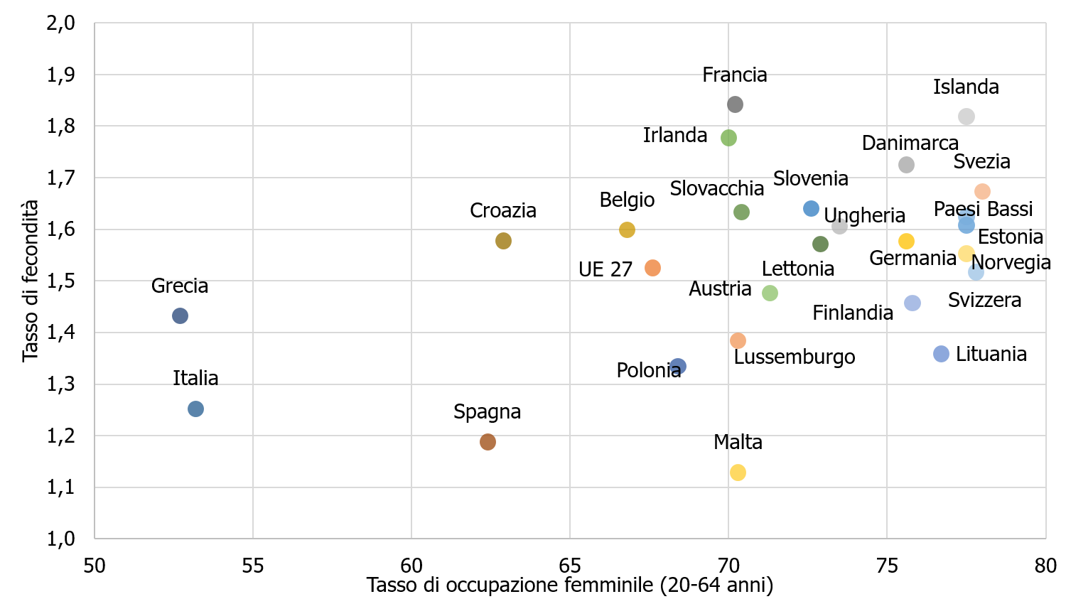 i fenomeni di denatalità e di scarsa occupazione femminile sono problemi strutturali ed emergenziali nel nostro Paese e sembrano essere legati tra loro. Un figlio influenza molto l'organizzazione familiare e la distribuzione dei compiti di lavoro, sia di cura sia di mercato, all’interno della famiglia: troppo spesso in presenza di un figlio è la donna a lasciare il lavoro per occuparsene. Sembrano essere sempre più urgenti politiche a sostegno della genitorialità.