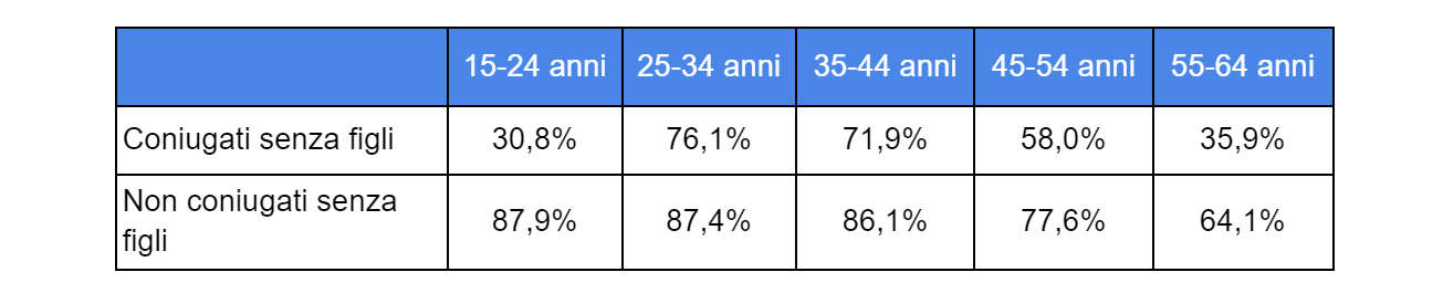 Ma non è solo un “problema di figli”. In Italia sembra che il solo formalizzarsi di un’unione implichi un cambiamento negli equilibri della coppia: il tasso di occupazione femminile delle donne senza figli diminuisce notevolmente con il matrimonio. In questo caso ci chiediamo: perchè? È solo un retaggio culturale?