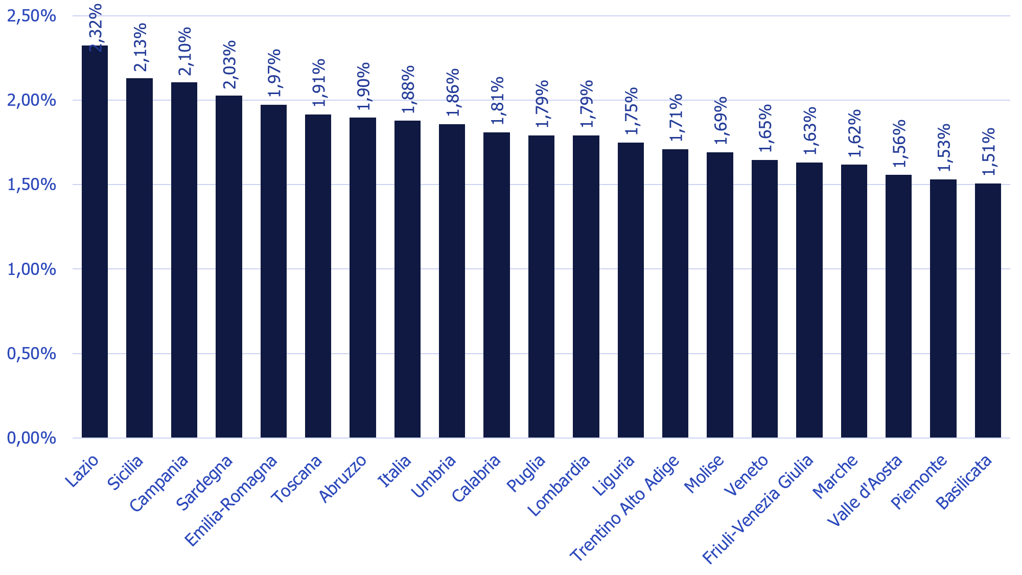 Le Regioni in cui si registra un minore rapporto tra medici e popolazione anziana sono Valle d’Aosta, Piemonte e Basilicata con circa 1,5 medici ogni 100 individui con 65 anni e più. In generale la variabilità è molto ampia. Tra Lazio e Basilicata, rispettivamente prima e ultima nella classifica determinata dal nostro indicatore, la differenza è di 0,81 punti percentuali Restringendo l’analisi ai soli medici di medicina generale, che svolgono la funzione di primo punto di accesso per il monitoraggio della popolazione anziana, la situazione è altrettanto eterogenea (grafico 2).