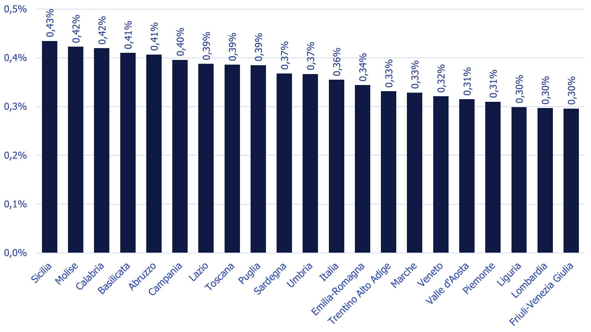 Nel grafico 1 è riportato il numero di medici rapportato alla popolazione over 65 delle Regioni italiane. L’indicatore coglie il numero di medici pro capite rispetto alla popolazione che ha la maggiore probabilità di fare ricorso ai servizi erogati da questi ultimi. Il tema è particolarmente rilevante a causa dell’invecchiamento della popolazione in quanto la popolazione anziana ricorre con regolarità ai servizi per la prevenzione e il monitoraggio di patologie. In Italia la percentuale di popolazione con più di 65 anni è pari al 22,55%; in Francia, Spagna e Germania è rispettivamente di 19,71%, 18,79% e 20,73%.