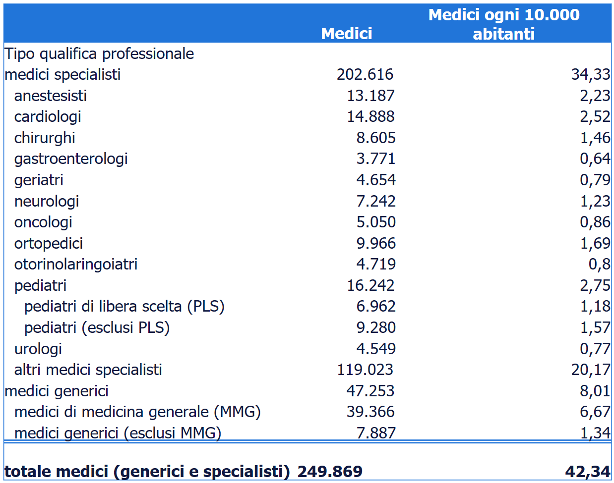 Le Regioni che superano la media nazionale sono Lazio, Sicilia, Campania, Sardegna, Emilia-Romagna, Toscana e Abruzzo. In particolare le prime 4 superano i 2 medici ogni 100 over 65.